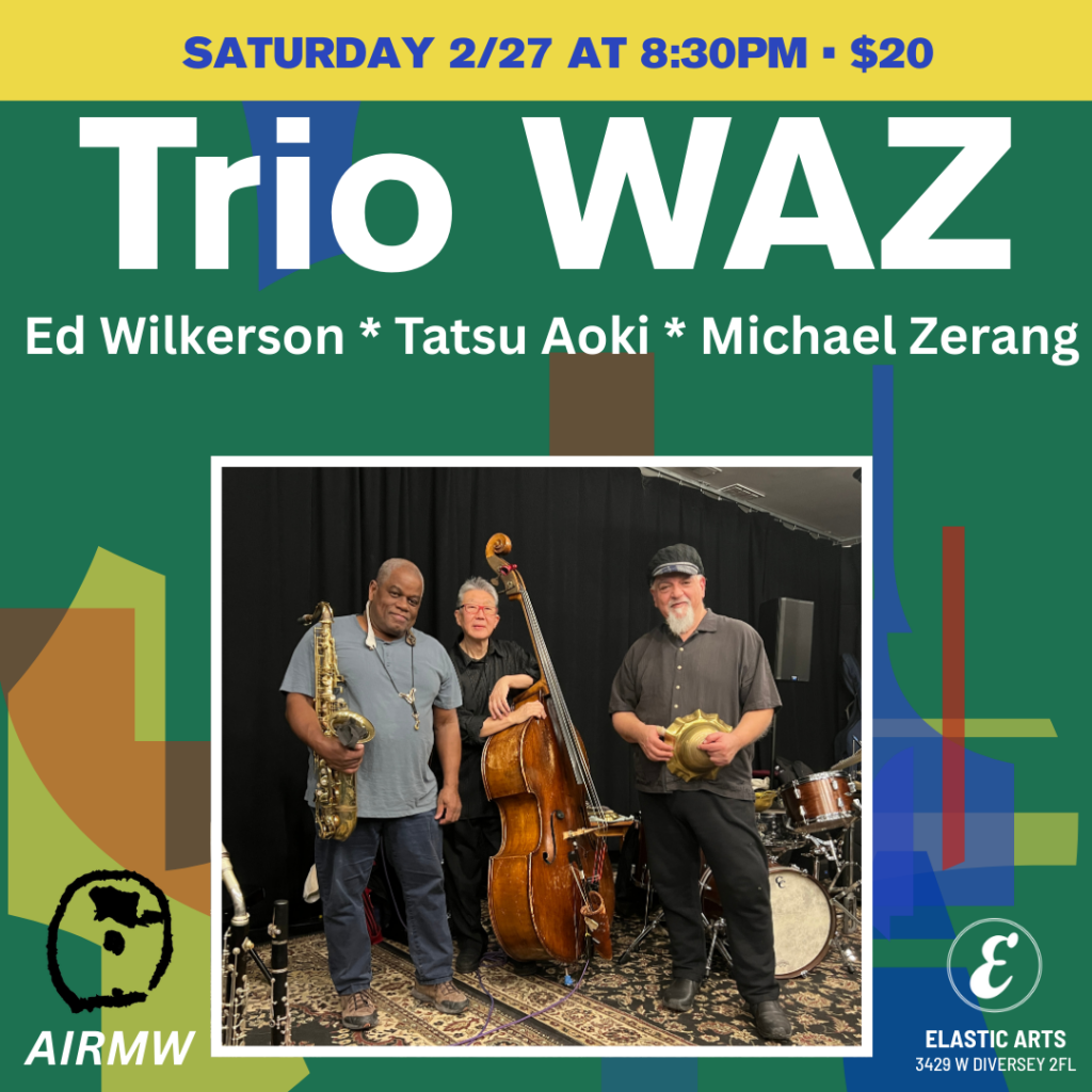 This performance has passed. Trio WAZ February 7, 2026 @ 8:00PM Edward Wilkerson, Jr – reeds Tatsu Aoki – contrabass, shamisen Michael Zerang – drums, percussion Details Date: February 7, 2026 Time: 8:00PM Venue Elastic Arts 3429 W Diversey Ave. #208 (formerly 2830 N. Milwaukee Ave.) Chicago, IL 60647 USA Phone: (773) 772-3616 https://elasticarts.org/